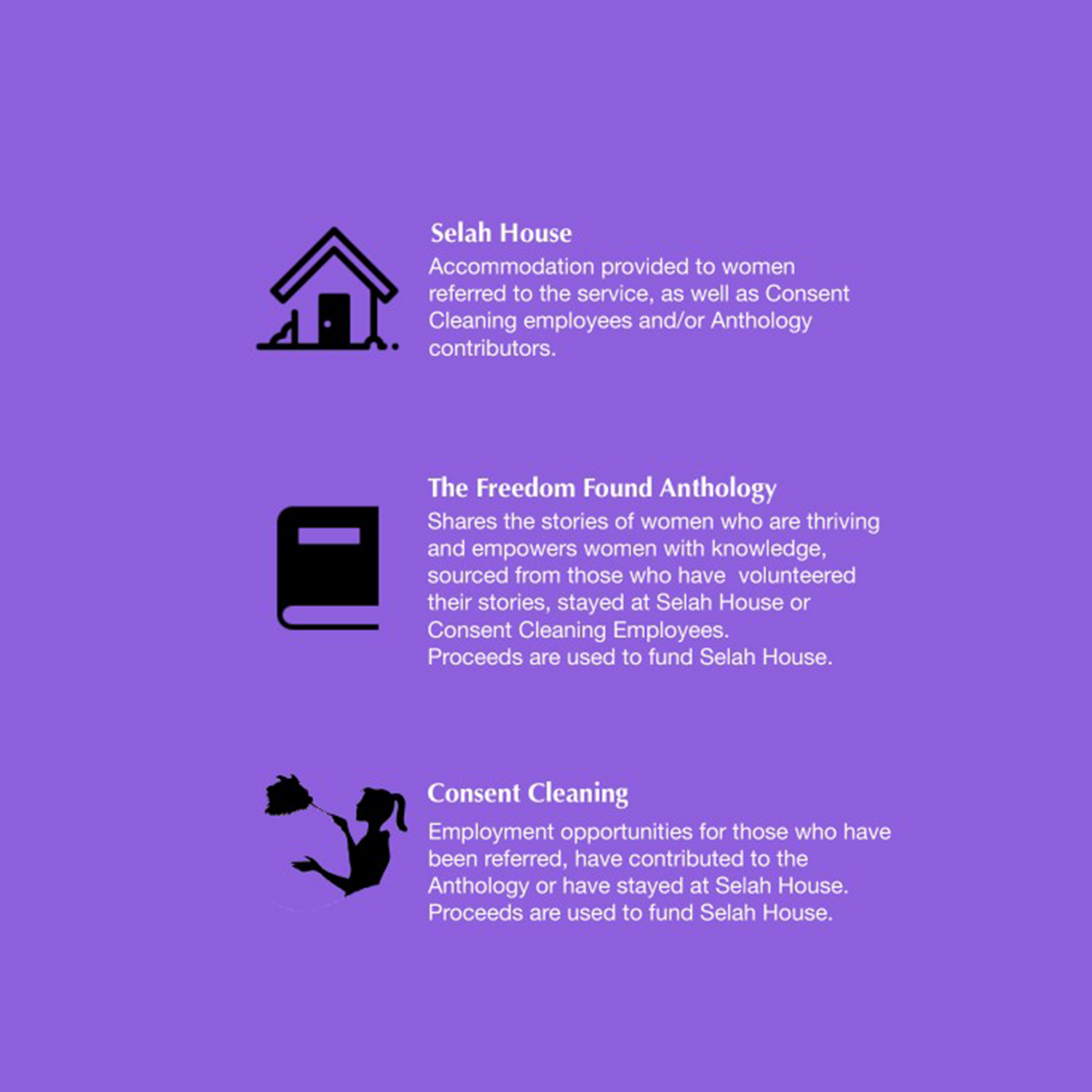 The Finding Freedom Project provides women who have escaped family violence, with work (Consent Cleaning), a safe place to rest (Selah House), and the ability to safely share their story to empower others (The Freedom Found Anthology).
